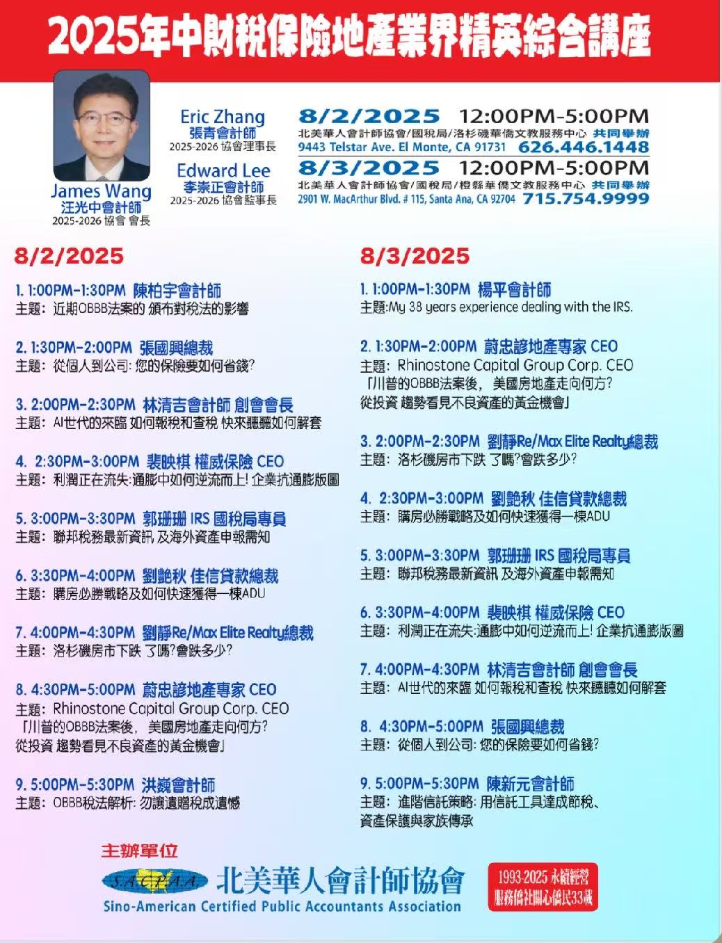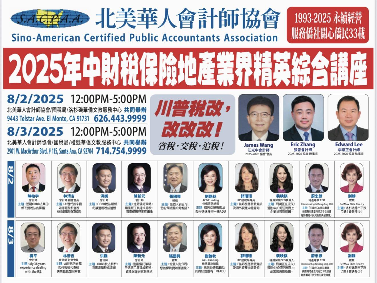 『美國華人電視呂力川洛杉磯報導』北美華人會計師協會「2025年中財稅、保險、地產綜合講座」於8月2日下午,在位於洛杉磯東區愛滿地市的洛杉磯文教中心成功舉行.講座邀請來自南加地區的9位專業人士發表演講,講員們針對『川普大而美法案』及最新稅務與房產政策進行深度解說。